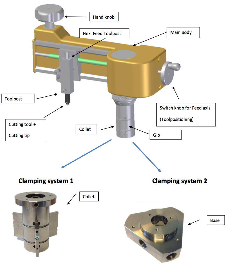 De MiniFacer EVO is uitgerust met een uitlijn mogelijkheid voor zowel cilindrisch alsook vlakke uitlijning . De EVO beschikt standaard over een klemsysteem met collet voor de diameters van 2″ – **” en een basis met regelbare klempoten.